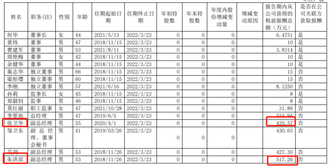 据中炬高新2021年年报披露,张卫华当年从公司获得的税前报酬总额为420.57万元,朱洪滨当年从公司获得的税前报酬总额为517.26万元。