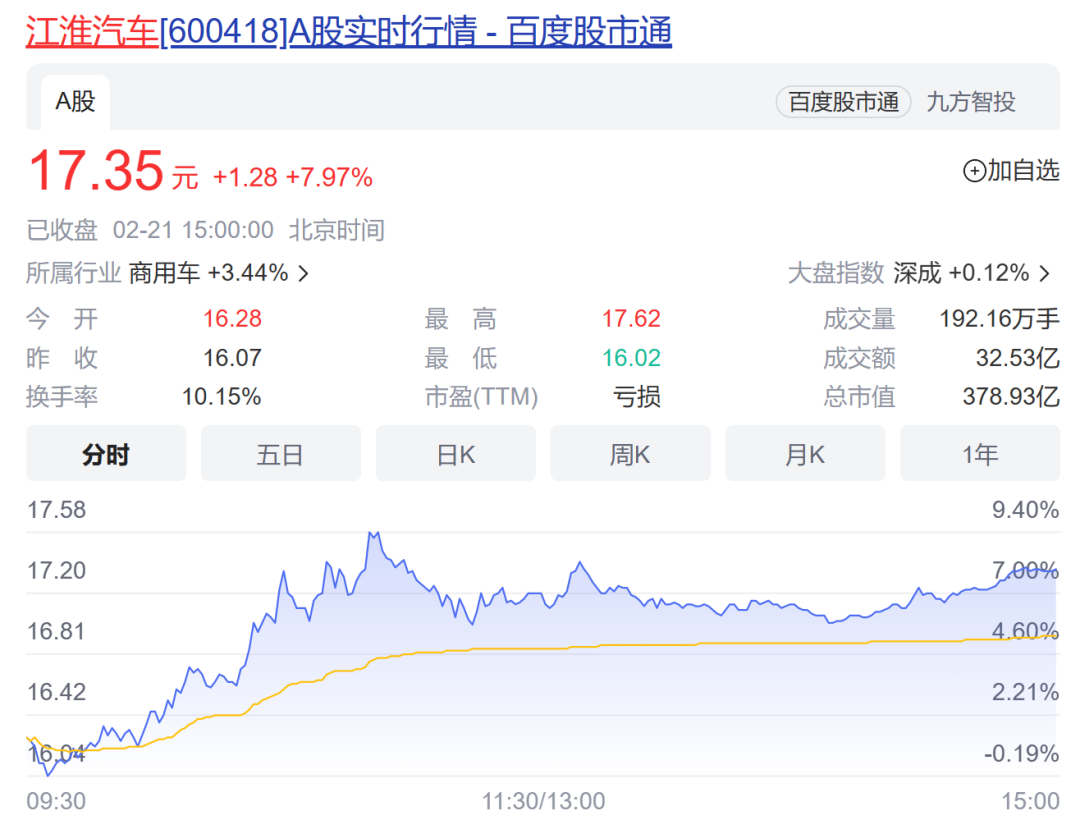 2月21日,汽车板块整体走强,江淮汽车一度逼近涨停,收盘股价上涨7.97%。