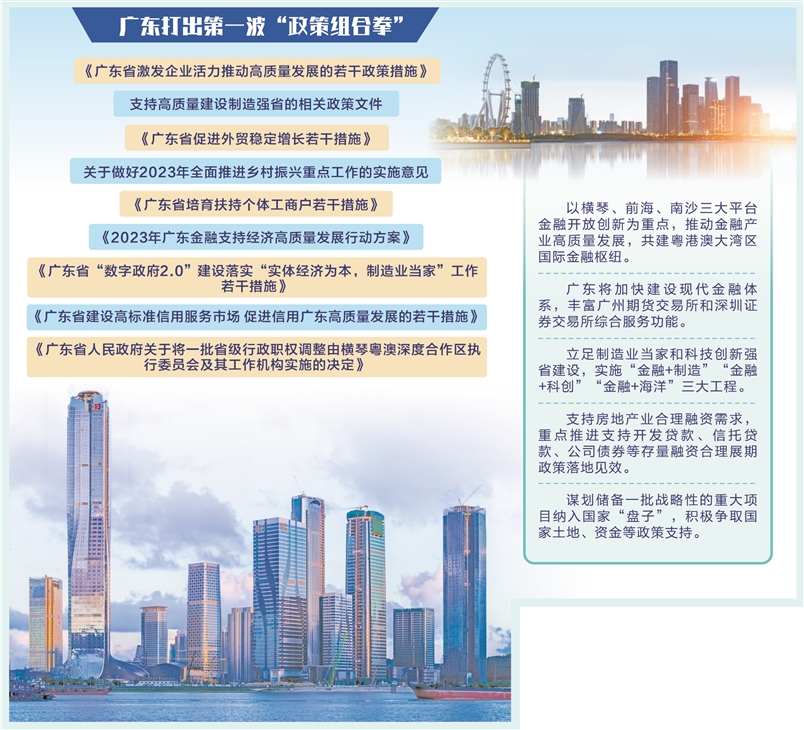《行动方案》从建设粤港澳大湾区国际金融枢纽、实施“金融+”工程、金融支持房地产、稳外贸、稳投资、促消费、绿色金融等方面,引导金融资源支持实体经济高质量发展,并提出了“力争2023年全省新增社会融资规模4万亿元”等多个发展目标。《措施》则从加大财税金融支持、加快恢复和提振消费等六大方面提振市场主体信心,激发企业活力。