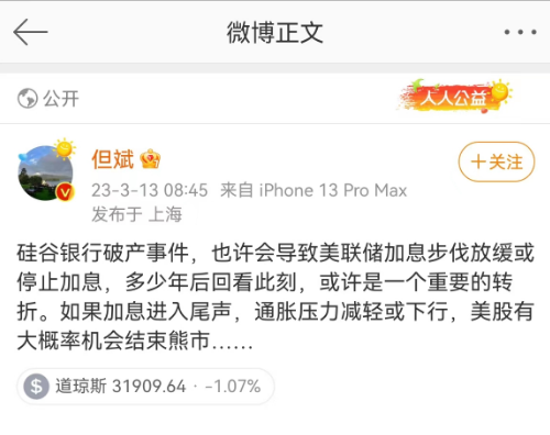 敏锐的投资者还从硅谷银行危机中看到机会。深圳东方港湾投资管理股份有限公司董事长但斌今日早间在微博发文表示,“硅谷银行破产事件,也许会导致美联储加息步伐放缓或停止加息,多少年后回看此刻,或许是一个重要的转折。如果加息进入尾声,通胀压力减轻或下行,美股有大概率机会结束熊市……”。