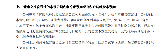 经董事会决议,大全能源2022年年度拟向全体股东每10股派发现金红利36元(含税)。截至审议本次利润分配方案的董事会召开日,公司总股本21.37亿股,以此计算合计拟派发现金红利76.95亿元(含税)。本年度公司现金分红比例为40.24%。