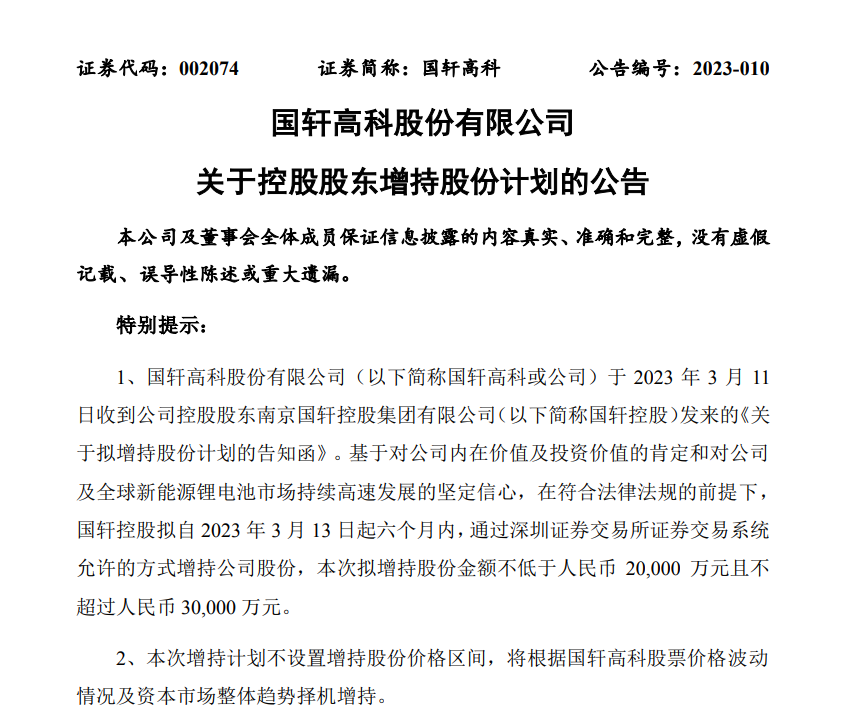 国轩高科3月11日收到公司控股股东国轩控股发来的《关于拟增持股份计划的告知函》。基于对公司内在价值及投资价值的肯定和对公司及全球新能源锂电池市场持续高速发展的坚定信心,在符合法律法规的前提下,国轩控股拟自3月13日起六个月内,通过深圳证券交易所证券交易系统允许的方式增持公司股份,本次拟增持股份金额不低于2亿元且不超过3亿元。拟增持股份的资金来源是国轩控股自有及自筹资金。