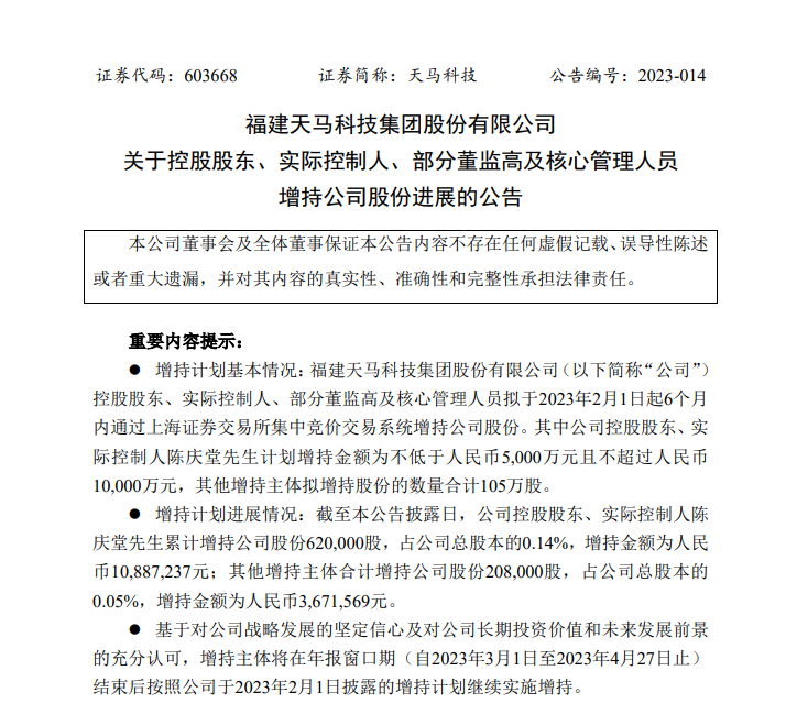 在此之前,天马科技公告,控股股东、实际控制人、部分董监高及核心管理人员拟于2月1日起6个月内通过上海证券交易所集中竞价交易系统增持公司股份。其中公司控股股东、实际控制人陈庆堂计划增持金额为不低于5000万元且不超过1亿元,其他增持主体拟增持股份的数量合计105万股。