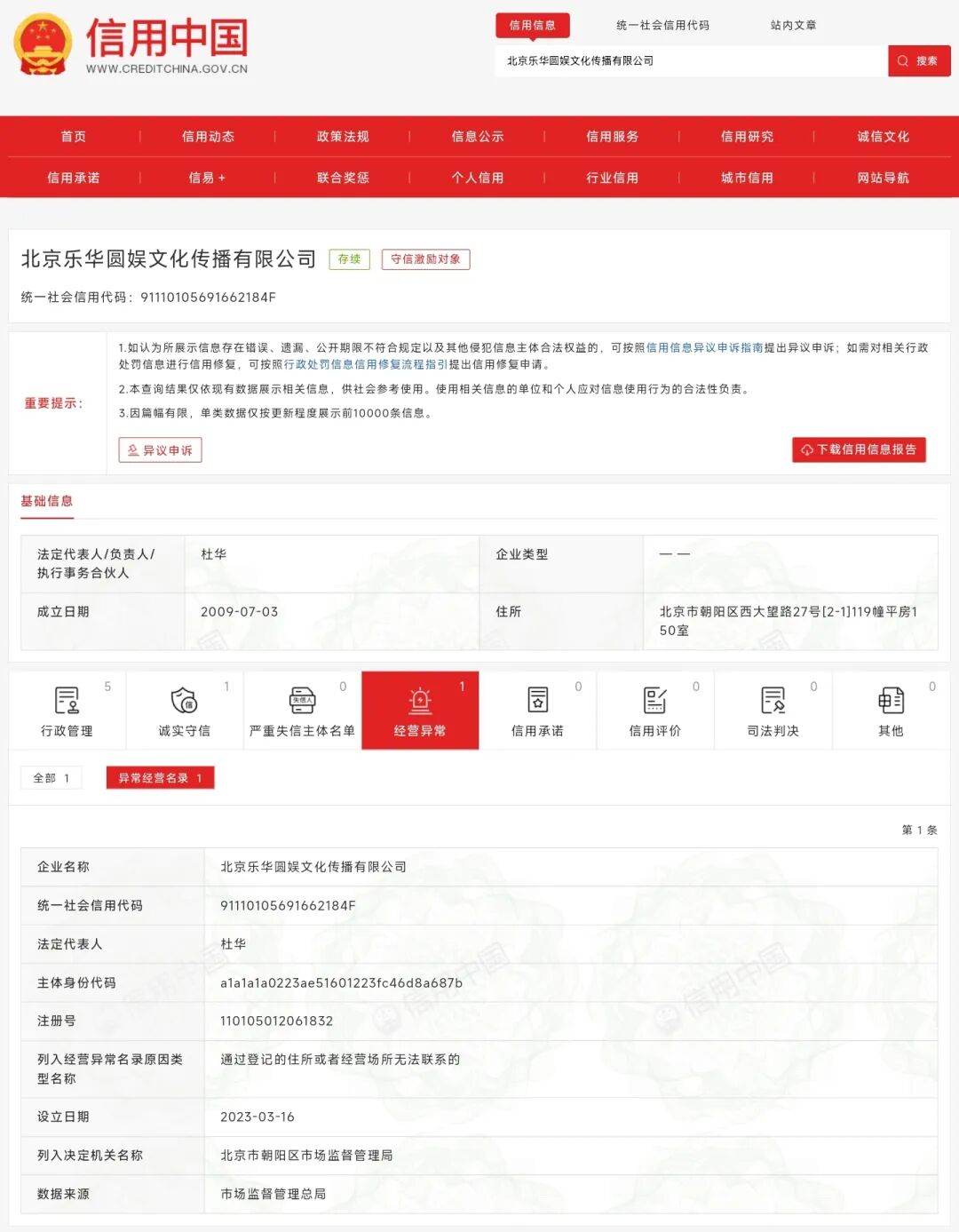 据信用中国网站消息,近日,因通过登记的住所或者经营场所无法联系,北京乐华圆娱文化传播有限公司(下称“乐华圆娱”)被北京市朝阳区市场监督管理局列入经营异常名录。