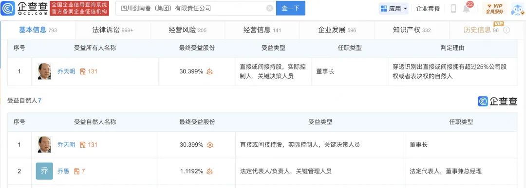 企查查最新数据显示,乔天明与乔愚通过直接或间接分别持有剑南春30.399%、1.1192%,合计持股31.5182%。