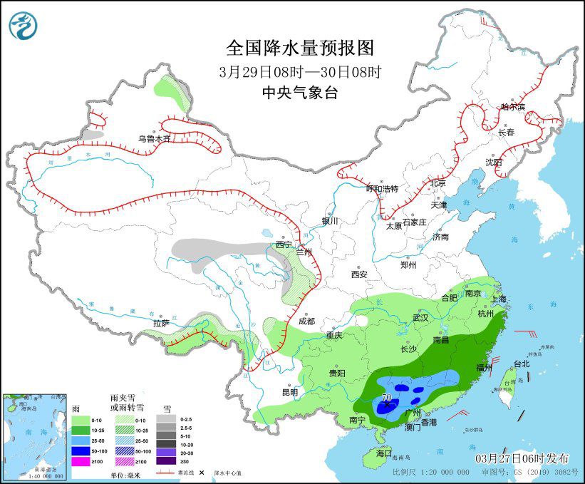 3月29日08时至30日08时,青海南部和东部、川西高原北部等地部分地区有小雪或雨夹雪。江南中东部和南部、华南大部等地部分地区有中到大雨,其中,广西东部、广东西部等地部分地区有暴雨(50~70毫米)。黑龙江西北部部分地区有4~5级风(见图3)。