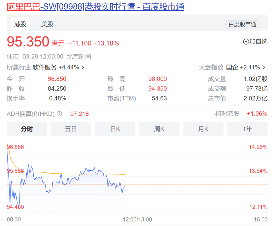 在阿里巴巴强势带动下,中概股普遍逆势上扬,高途涨9%,腾讯控股ADR涨8.03%,百度涨4.73%,京东涨4.45%,小米ADR涨3.02%。