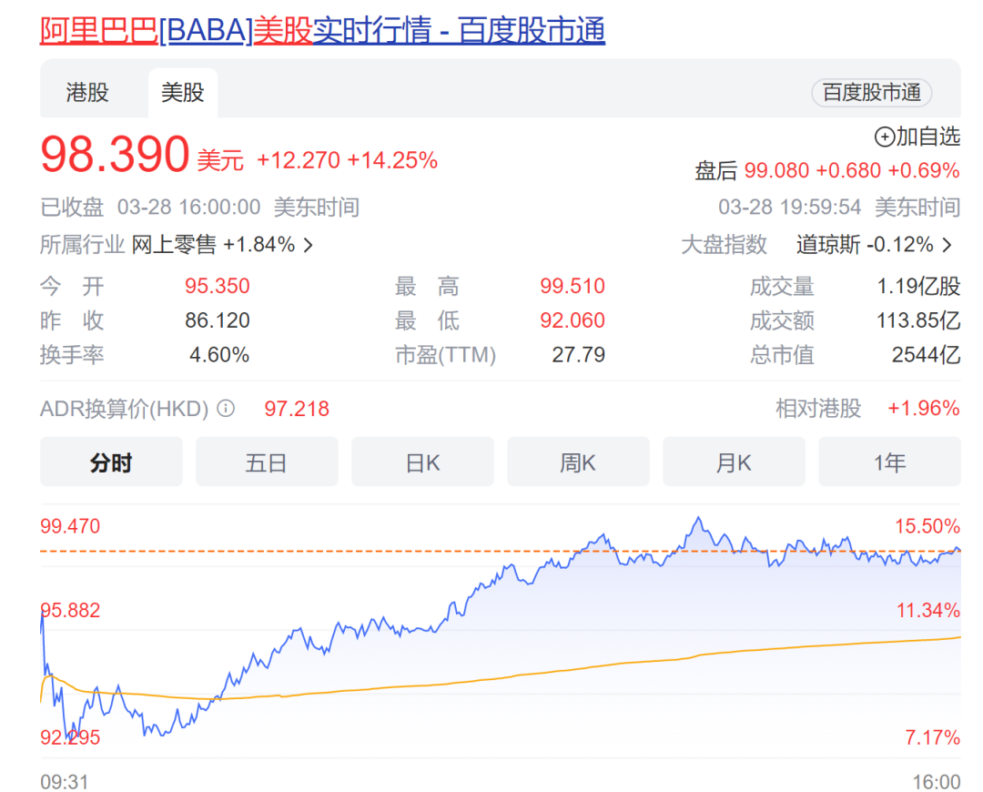 隔夜在美国上市的阿里巴巴放量飙升,开盘就大涨10.72%,随后继续走高,最高冲至涨15.55%,创2022年6月以来最大单日涨幅,市值一夜大涨近320亿美元,成交量急剧放大近9倍。