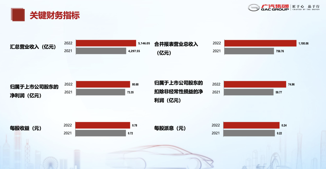 值得一提的是,2022年,广汽集团分红率稳定在30%以上水平,全年向全体股东派发每10股2.4元(含税)股息,全年累计派发股息总额约25.16亿元(含中期股息)。