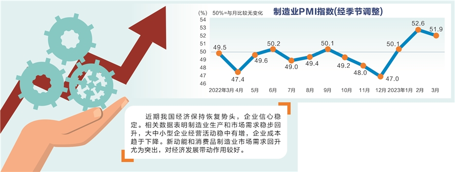 经济发展仍在企稳回升中。3月31日,国家统计局服务业调查中心和中国物流与采购联合会发布了最新中国采购经理指数(PMI)。数据显示,3月制造业PMI、非制造业商务活动指数和综合PMI产出指数等三大指数连续三个月位于扩张区间。其中,新动能和消费品制造业市场需求回升尤为突出,建筑业加速扩张。