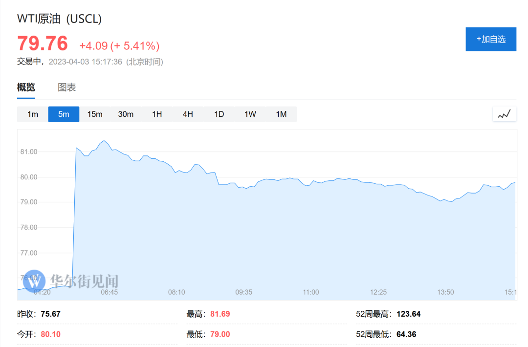 继上周一大涨超5%,刷新年内单日最大涨幅后,WTI原油在4月3日更是冲抵80美元/桶关口,日内最大涨幅突破前高。