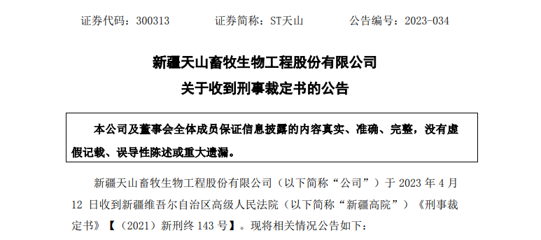 2023年4月12日,ST天山收到新疆高院《刑事裁定书》。