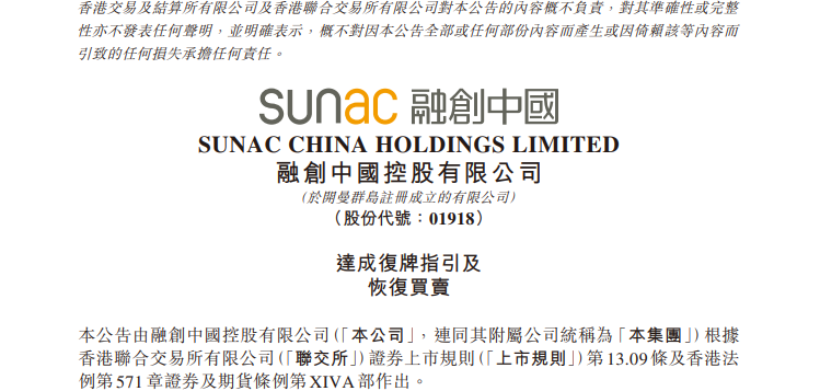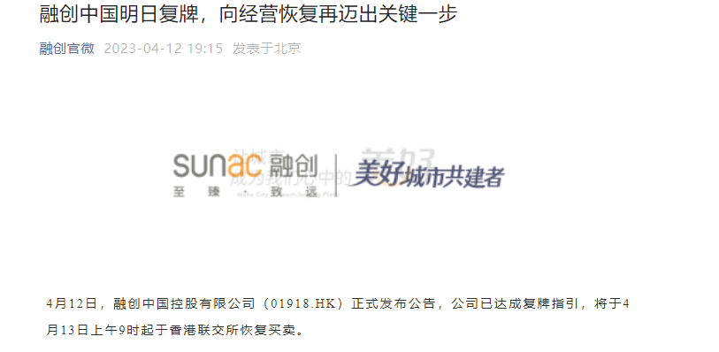 值得一提的是,4月12日晚间,融创中国也在其公众号表示,去年以来,公司全力推进经营恢复工作,此次股票成功复牌,标志着公司再次获得关键性进展。