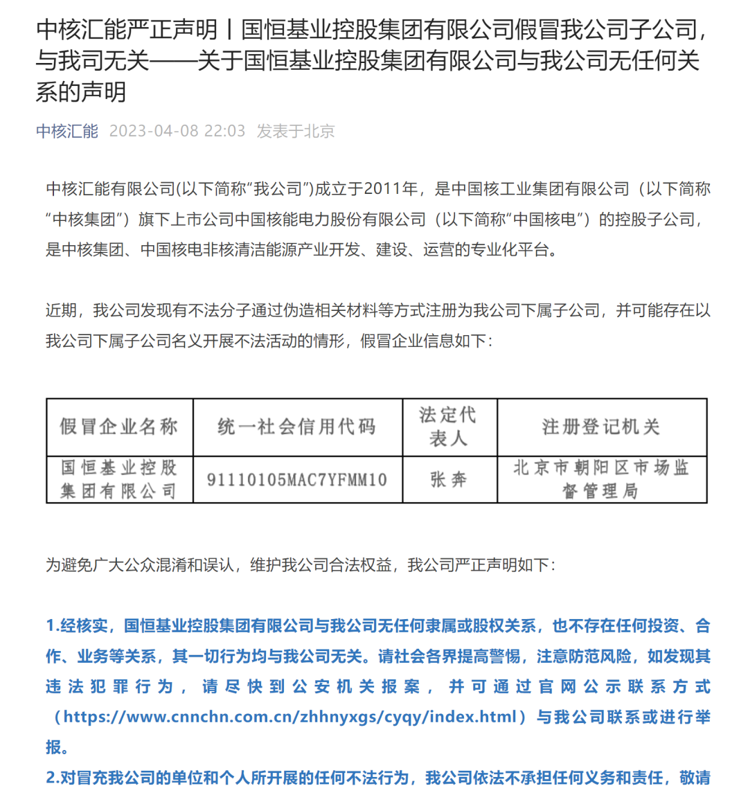 近期,证券时报·e公司持续报道“假央企”事件,4月8日晚间,央企中国核电旗下控股子公司中核汇能接连通过其官网、微信公众号发布严正声明,指出一家全名为国恒基业控股集团有限公司(以下简称“国恒基业”)的企业,通过伪造相关材料等方式注册为中核汇能下属子公司,并可能存在以中核汇能下属子公司名义开展不法活动的情形。