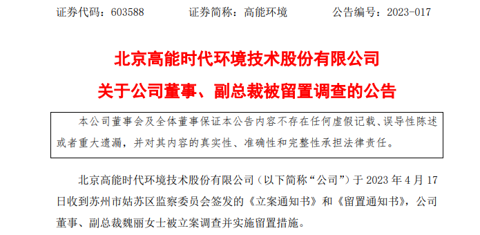 市值150亿元的上市公司高能环境(603588)4月18日晚间公告,公司昨日收到苏州市姑苏区监察委员会签发的《立案通知书》和《留置通知书》,公司董事、副总裁魏丽被立案调查并实施留置措施。高能环境表示,尚未知悉魏丽被立案并留置调查的具体原因。