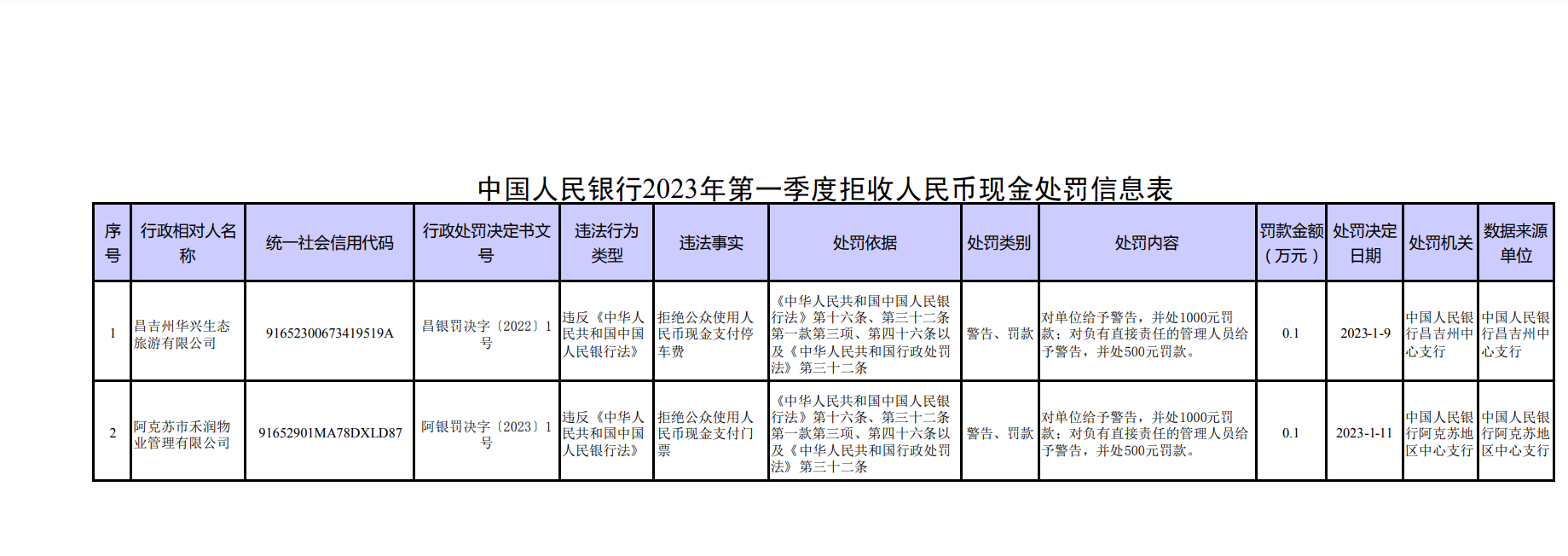 昌吉州华兴生态旅游有限公司拒绝公众使用人民币现金支付停车费,对单位给予警告,并处1000元罚款;对负有直接责任的管理人员给予警告,并处500元罚款。