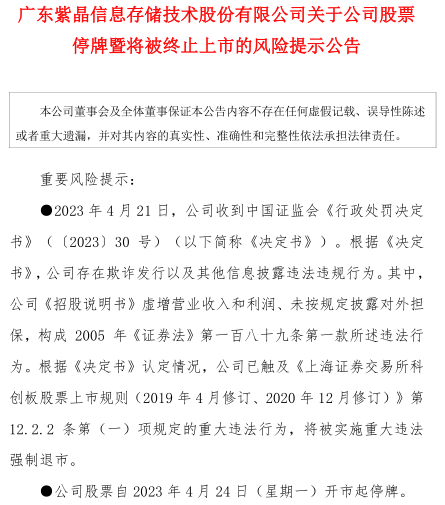 4月21日,*ST紫晶(688086、紫晶存储)和*ST泽达(688555、泽达易盛)分别发布公告称,公司于当天收到中国证监会《行政处罚决定书》。