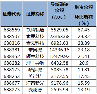 证券时报网讯,wind统计显示,4月21日共有191只科创板个股融资余额环比增加。其中,6股融资余额增幅超过20%。融资余额增幅最大的是铁科轨道,最新融资余额为5529.05万元,环比增幅达67.45%;融资余额增幅较大的还有索辰科技、青云科技、帝奥微、颀中科技、理工导航等股。