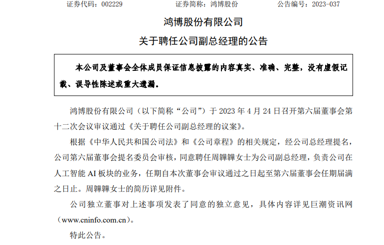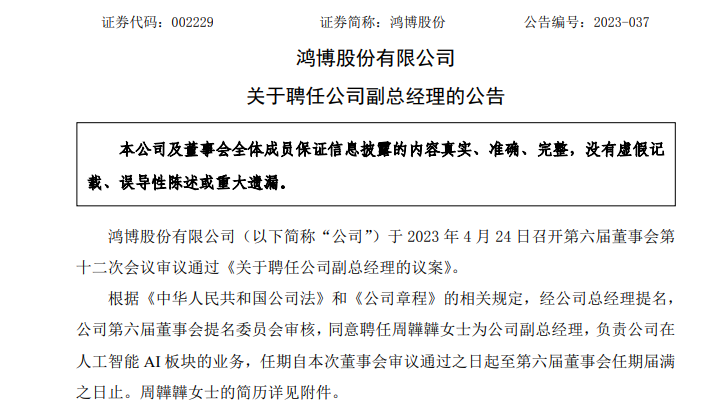 4月24日午后,A股鸿博股份强势涨停。晚间,公司发布了一则公告:聘任周韡韡女士为公司副总经理,负责公司在人工智能AI板块的业务。