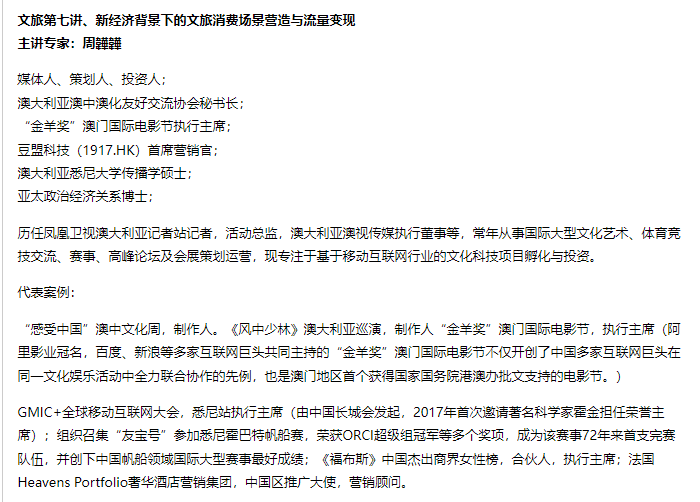 而在加入豆盟之前,周韡韡在传媒行业拥有超过10年工作经验:曾任凤凰卫视澳大利亚记者站记者、活动总监,澳大利亚澳视传媒执行董事等,常年从事国际大型文化艺术、体育竞技交流、赛事、高峰论坛及会展策划运营,也曾专注于基于移动互联网行业的文化科技项目孵化与投资。