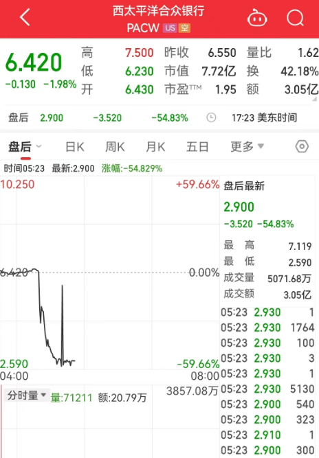 截至当地时间5月3日收盘,西太平洋合众银行报6.42美元,跌幅1.98%,市值7.72亿美元。值得注意的是该股美股盘后跌超50%。