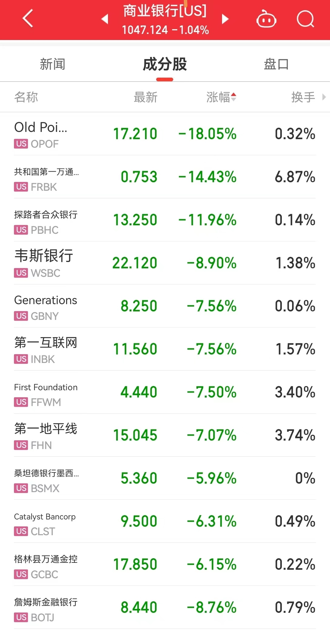 其他地区银行股中,WAL跌超25.6%,齐昂银行、CMA、KeyCorp、嘉信理财等至多跌8.2%。
