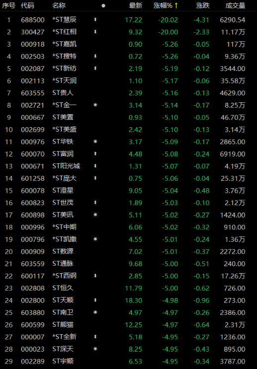 5月5日,多家公司发布2022年年报后被实施退市风险警示和其他风险警示公告,*ST慧辰、*ST红相双双20cm跌停,包括*ST嘉凯、*ST搜特、*ST新纺、ST贵人等合计超40只成份股封跌停。