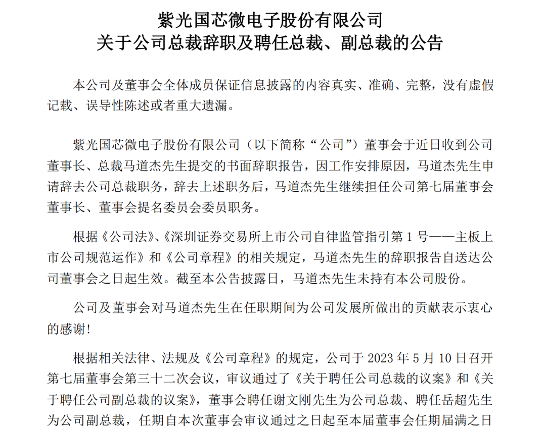 作为紫光集团旗下主要芯片上市平台,紫光国微(002049)5月10日晚间披露人事变动,公司董事长、总裁马道杰因工作安排,辞去总裁职务,继续担任董事长和董事会提名委员会委员职务;另外,董事会聘任谢文刚为公司总裁、聘任岳超为公司副总裁。