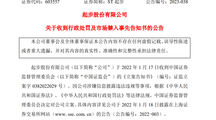5月10日晚,ST起步也受到了上交所监管工作函。针对《事先告知书》认定的违法事实,上交所已对公司及相关责任人启动纪律处分程序,将予以严肃惩处。