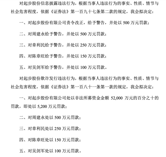 对ST起步欺诈发行违法行为,证监会拟决定对ST起步处以非法所募资金金额5.2亿元10%的罚款,即罚款5200万元,并对高管处以罚款。