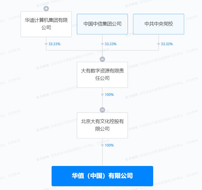 从此次交易的对手方来看,天眼查APP显示,华值(中国)有限公司(下称“华值中国”)成立于2020年,注册资本1亿元,参保人数11人,法人为何楠林。从股权结构看,华迪计算机集团有限公司、中国中信集团公司、中共中央党校分别持股33.33%。