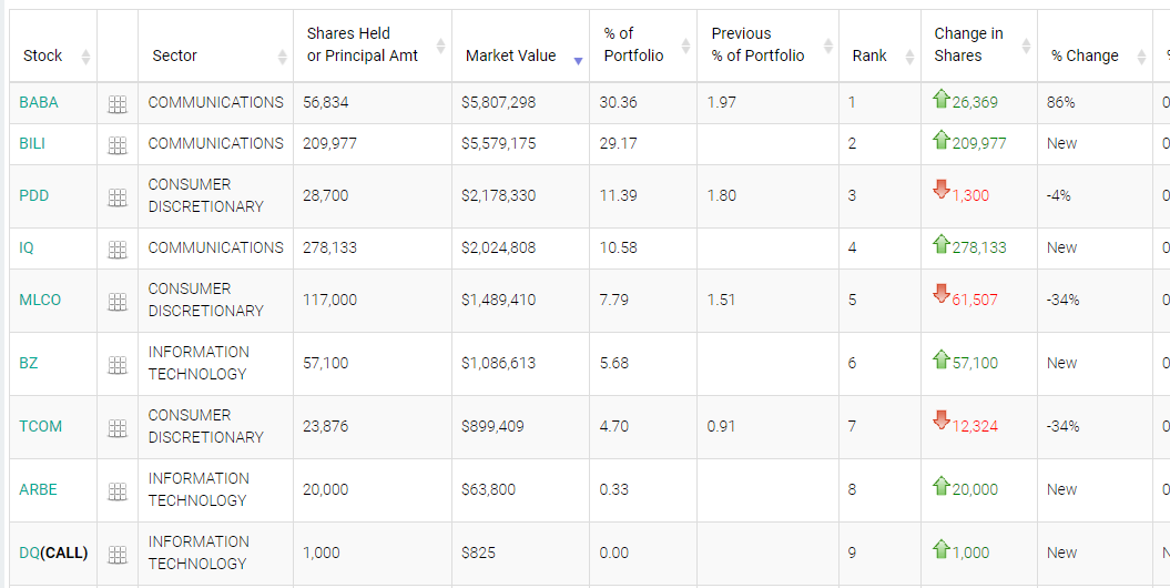 根据数据平台whalewisdom,Top Ace对阿里巴巴、哔哩哔哩、爱奇艺、看准网等均进行了加仓操作。其中,阿里巴巴成为Top Ace第一大重仓股,持仓市值达580.7万美元,持仓占比达30.36%。其次为哔哩哔哩,持仓市值达557.9万美元,持仓占比为29.17%。