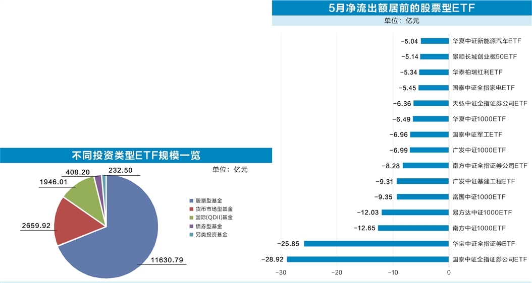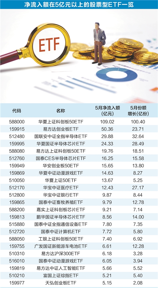 数据宝统计,剔除年内上市的新基,5月至今,共计23只股票型ETF获5亿元以上大额净流入。华夏上证科创板50ETF、易方达创业板ETF、国联安中证全指半导体ETF、华夏国证半导体芯片ETF月内资金净流入额居前,依次为109.02亿元、50.36亿元、29.88亿元、24.33亿元。
