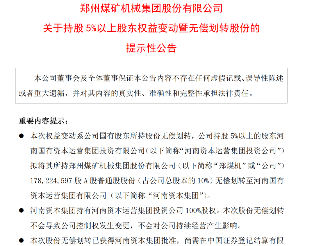就在前一天(5月21日),郑煤机也收到持股5%以上的股东河南资本运营集团投资公司通知,获悉河南资本运营集团投资公司与河南资本集团于5月19日签署了《上市公司国有股份无偿划转协议》,河南资本运营集团投资公司拟将其持有的郑煤机约1.78亿股股份(占公司总股本的10%)无偿划转至河南资本集团。