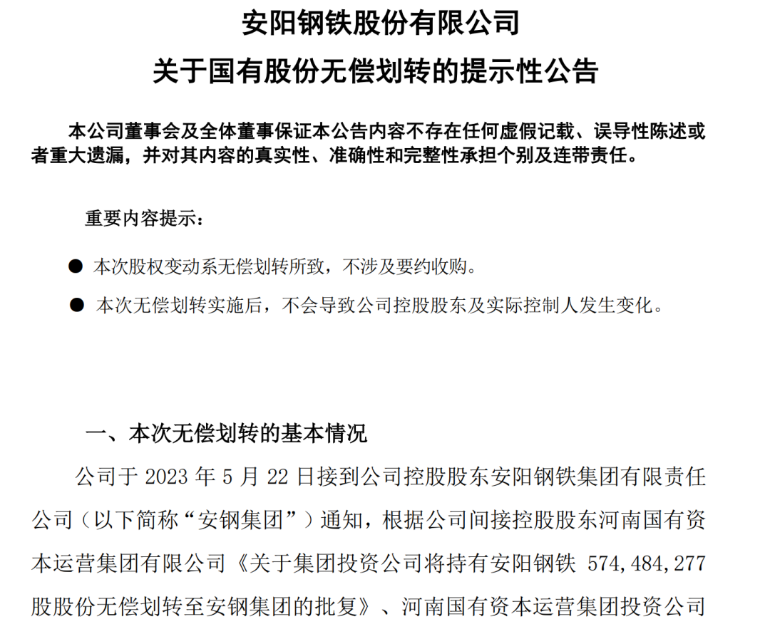 5月22日晚,安阳钢铁(600569)发布公告,公司当日接到公司控股股东安钢集团通知,根据公司间接控股股东河南国有资本运营集团有限公司相关批复,以及河南国有资本运营集团投资公司相关决议,河南资本集团投资公司拟将其持有的安阳钢铁5.74亿股人民币普通股股份(占公司总股本20%),无偿划转至安钢集团。