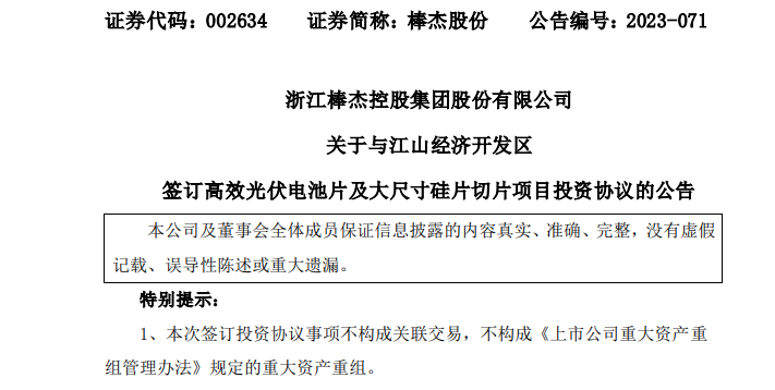 5月22日,棒杰股份董事会审议通过了《关于与江山经济开发区签订高效光伏电池片及大尺寸硅片切片项目投资协议的议案》,同意公司及子公司棒杰新能源集团有限公司(下称“棒杰新能源”)与江山经济开发区管委会签署《投资协议书》,投资建设年产16GW(8GW+8GW)N型高效电池片及年产16GW大尺寸光伏硅片切片项目。
