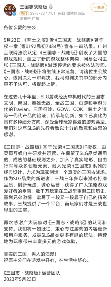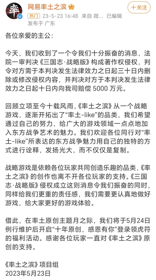 判决消息公布后,5月23日,网易《率土之滨》项目组和《三国志·战略版》运营团队分别就此发布声明。