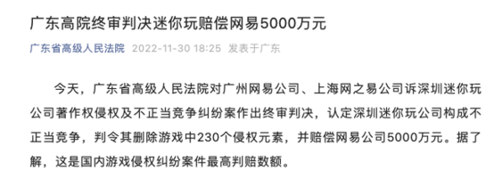 深圳市迷你玩科技有限公司被判构成不正当竞争,广东省高级人民法院判令其删除游戏中的230个侵权元素,并赔偿网易公司5000万元。