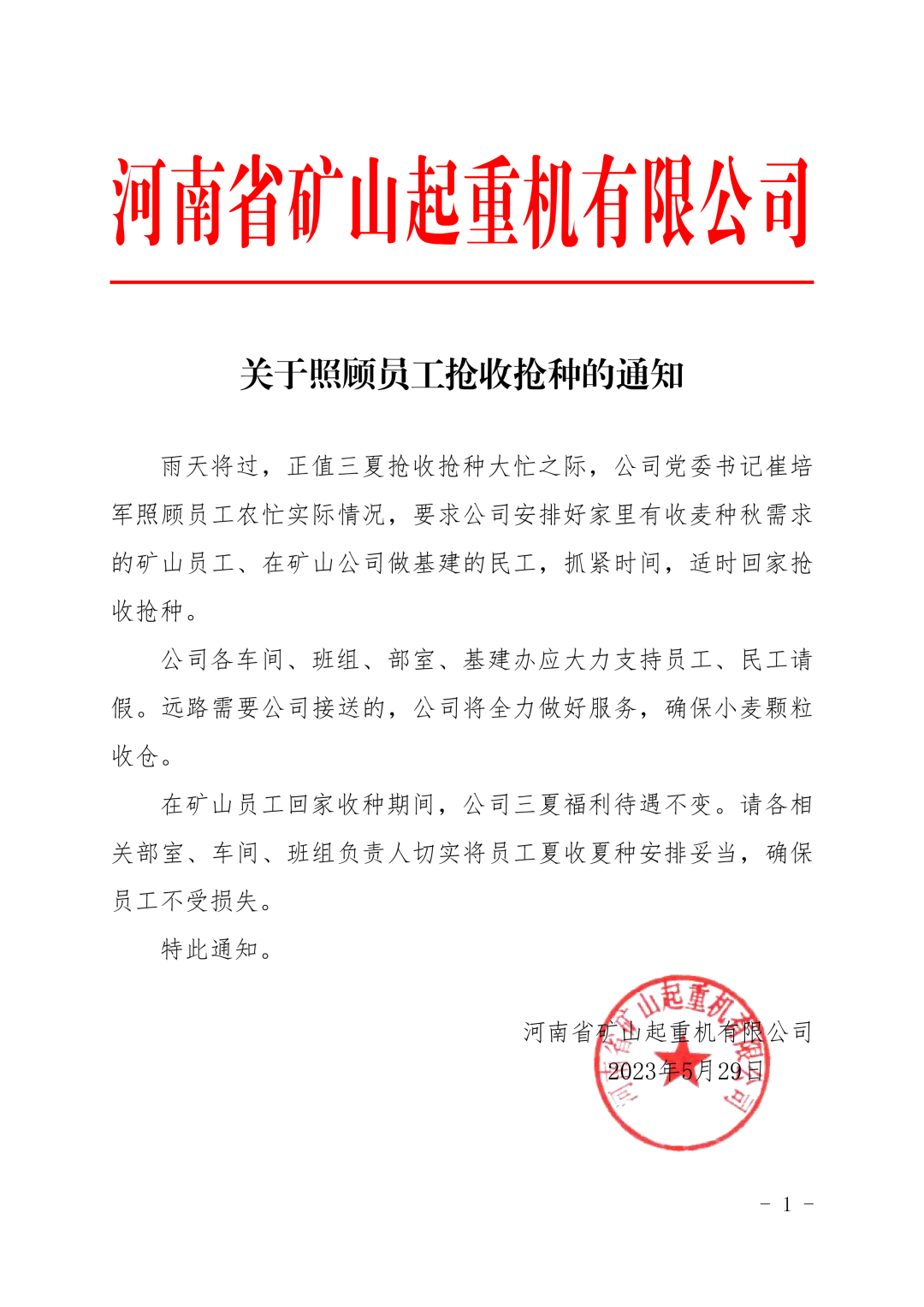 “为照顾员工农忙实际情况,公司已要求安排好家里有收麦种秋需求的员工、基建民工,抓紧时间适时回家抢收抢种。”位于新乡的河南省矿山起重机有限公司,近日下发关于照顾员工抢收抢种的通知,要求该公司各车间、班组、部室、基建办大力支持员工、民工请假,切实将员工夏收夏种安排妥当。