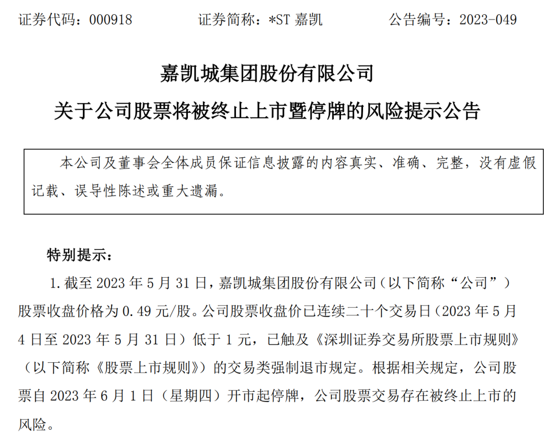 A股房企退市名单再添一员。5月31日晚间,*ST嘉凯(000918)公告,截至5月31日,公司股票收盘价为0.49元/股,已连续20个交易日低于1元,已触及交易类强制退市规定。公司股票自6月1日(星期四)开市起停牌,公司股票交易存在被终止上市的风险。依据规定,公司股票将不进入退市整理期。