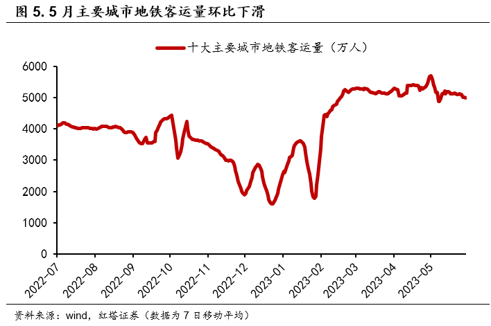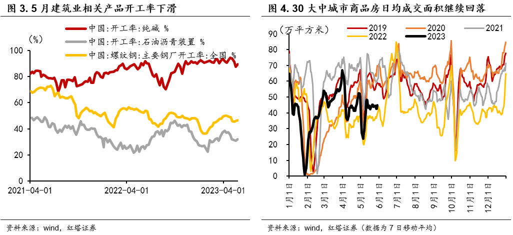 建筑业PMI回调5.7个百分点,其中新订单指数为49.5%,比上月下降4个百分点,基建和房建需求回落。高频数据显示施工进度进一步放缓,5月石油沥青装置、主要钢厂螺纹钢、以及纯碱开工率明显环比下滑。