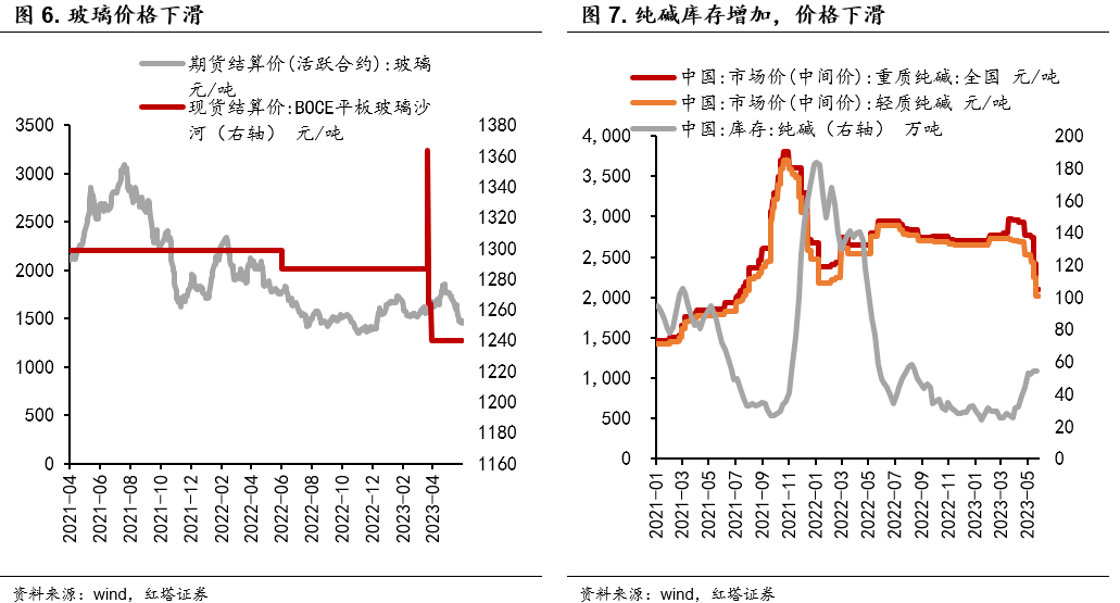房建和基建的上游商品价格下滑更为明显,尤其是玻璃及其上游纯碱等典型商品。今年以来,随着房地产竣工加速,玻璃需求增加,一季度玻璃现货期货价格都大幅提高。但是,4月末玻璃期货价格开始大幅下滑,近期现货价格也出现回落,这反映出在当下需求回落的同时未来预期也偏谨慎。当中下游观望情绪浓厚的时候,上游的生产速度也放缓了,作为制作玻璃原材料之一的纯碱的库存明显增加。