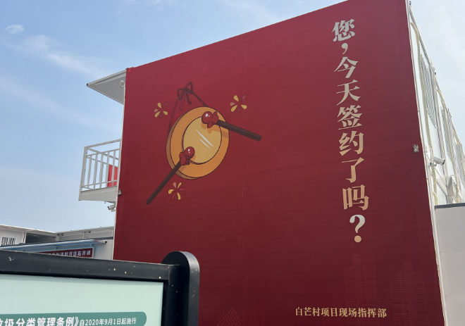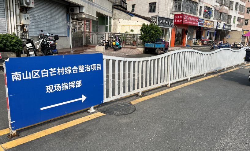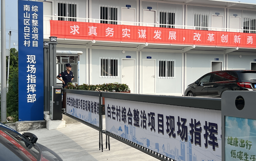 然而这次进村,白芒村里显得特别安静。进村没多远,路口“南山区白芒村综合整治项目现场指挥部“的蓝色指示牌很清晰,循着指示牌的方向,远远地就看到指挥部旁高墙上醒目地提醒:您,今天签约了吗?此前聚集了众多人群的指挥部里,此时也并没有什么人,签约的人不多,咨询、投诉的人也没有,并无异常。