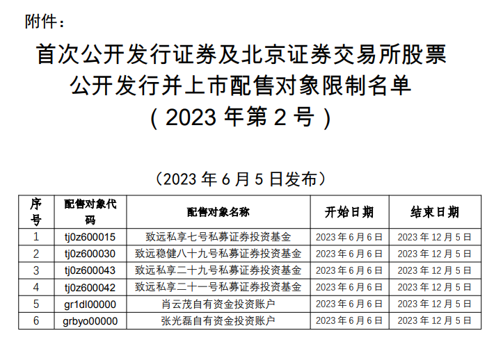 证券时报网讯,中证协6月5日发布首次公开发行证券及北京证券交易所股票公开发行并上市配售对象限制名单公告(2023年第2号)。协会决定对主板“中信金属”等项目网下询价和配售过程中,存在《管理规则》第四十一条规定情形的配售对象列入限制名单。列入限制名单时限自本公告发布之次日(工作日)起计算。