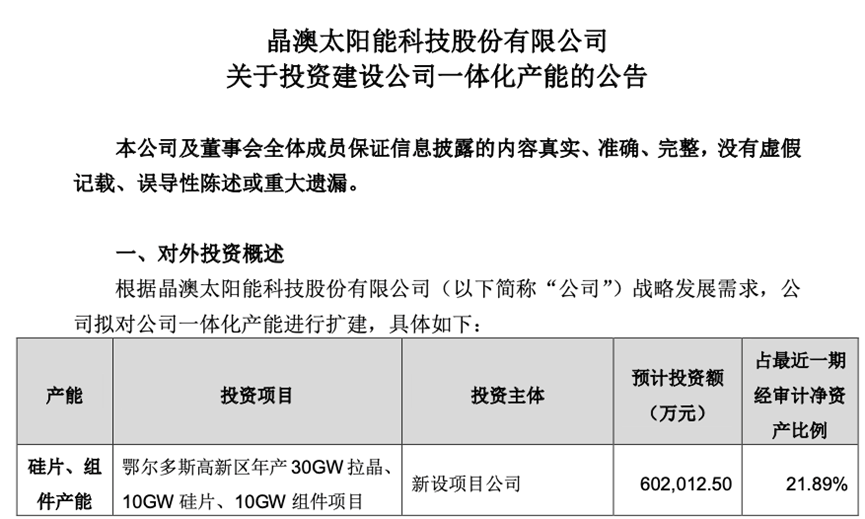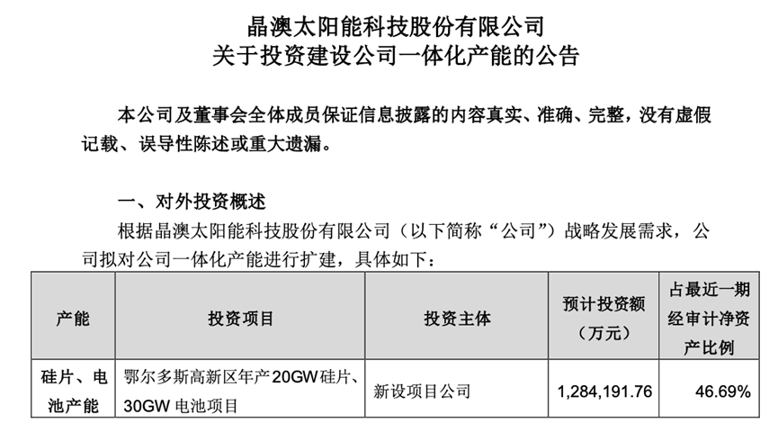 今年3月22日,晶澳科技曾公告,拟投资128.4亿元,建设鄂尔多斯高新区年产20GW硅片、30GW电池项目。该投资额占公司最近一期经审计净资产比例约46.7%。