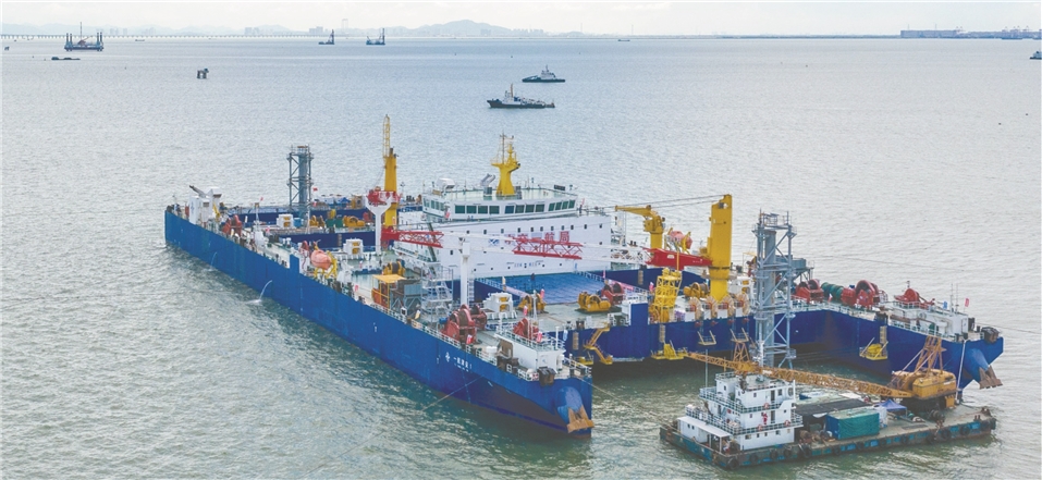 这是6月9日,“一航津安1”号沉管运输安装一体船在沉放安装E23管节和最终接头。新华社/图文