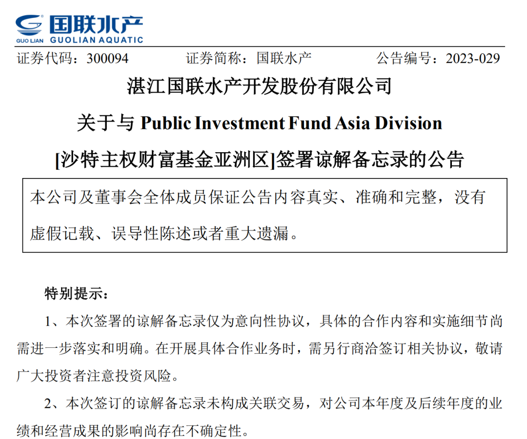 6月13日晚间,国联水产(300094)发布公告称,公司在6月12日与Public Investment Fund Asia Division(沙特主权财富基金亚洲区,以下简称“PIF”)签订了《谅解备忘录》,基于双方合作基础,公司将与PIF在国际海鲜贸易项目和全球采购业务方面进行合作,PIF对公司进行投资或融资支持,共涉及金额5.6亿美元。