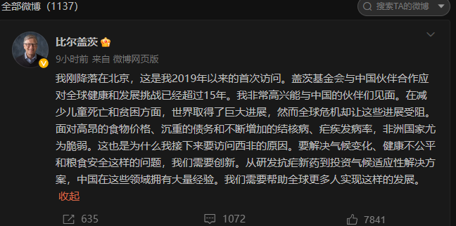 比尔·盖茨在微博重点谈及健康和气候话题,他表示,在减少儿童死亡和贫困方面,世界取得了巨大进展,然而全球危机却让这些进展受阻。要解决气候变化、健康不公平和粮食安全这样的问题,我们需要创新。从研发抗疟新药到投资气候适应性解决方案,中国在这些领域拥有大量经验。我们需要帮助全球更多人实现这样的发展。