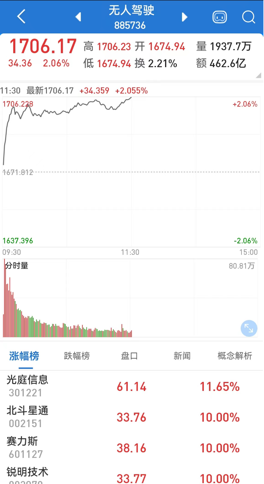 在政策利好的刺激下,汽车产业链相关板块近来连续走强。今日,汽车股再度全线上攻,其中无人驾驶板块放量高开高走,涨近2%,再创近1年来新高,半日成交接近前一交易日全天成交,北斗星通、得润电子、星光农机等多股开盘后就直线拉升,不到10分钟就封涨停。