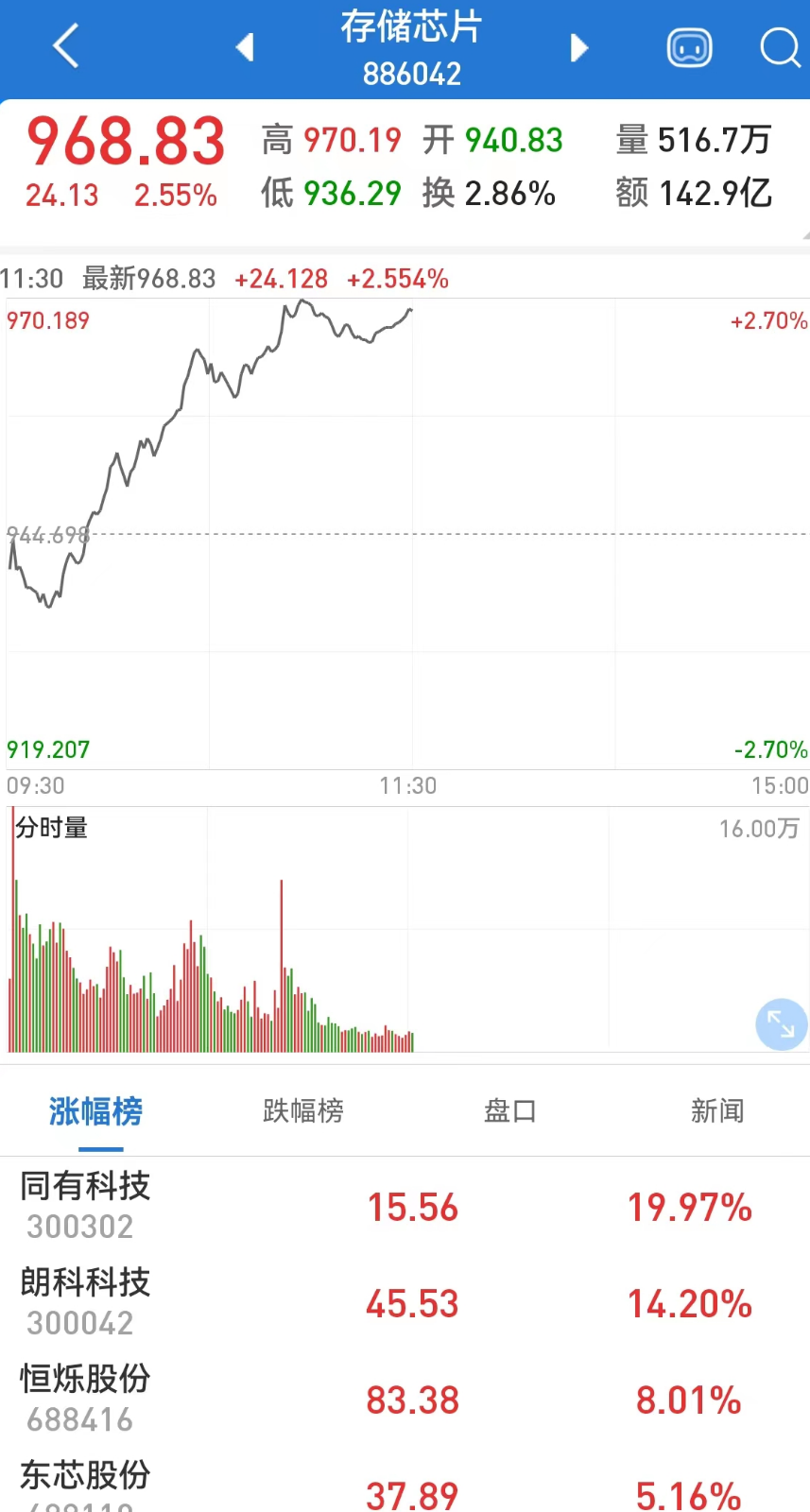 细分储存芯片板块涨势最佳,板块指数盘中一度涨近3%,逼近历史最高点,半日成交超前一交易日全天成交;汽车芯片板块亦涨超2%,创2个月来新高;英伟达概念、MCU芯片、光刻机、第三代半导体等板块亦涨幅居前。